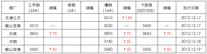 型材鋼廠一周調(diào)價(jià)匯總(12.14-12.21)