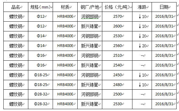 邯鄲市場螺紋鋼最新價格行情8月31日